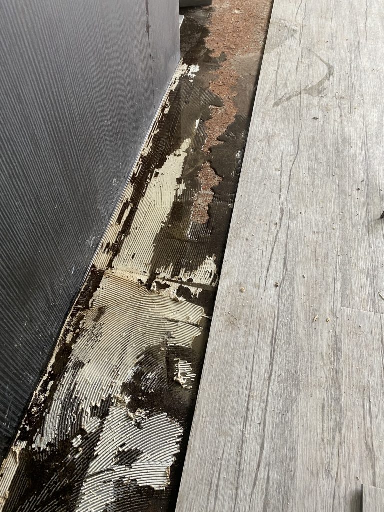 To facilitate drying and decontamination of the property, we promptly removed cabinetry, wall lining and flooring. The vinyl flooring throughout the building was laid across Masonite underlay. As the Masonite was stapled to the yellow tongue subfloor, the team had to remove and hammer tens of thousands of staples to leave the property in a safe manner. To prevent additional mould and bacteria growth occurring during removal, antimicrobial treatments were conducted across these areas.